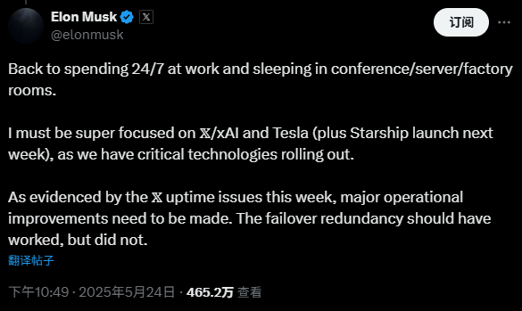 他还提到,社交平台X平台本周宕机的问题表明,公司在运营上必须进行重大改进,“故障转移冗余机制本应生效,但没有发挥作用。”