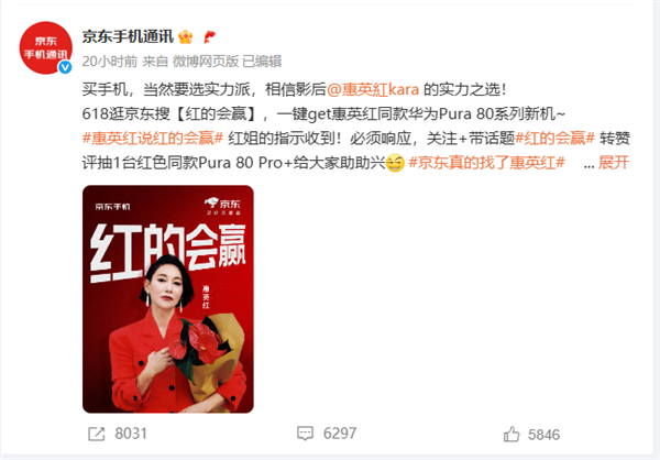 而最终京东手机通讯率先采纳建议,邀请惠英红担任推广大使,并围绕“红的会赢”这一主题展开互动。