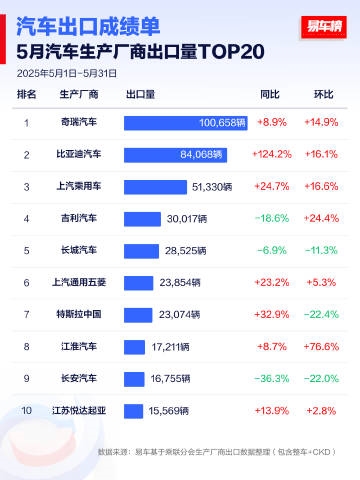 快科技6月12日消息,易车榜今日发布了5月份国内车企出口量Top20榜单。