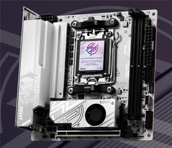 MPG B850I EDGE TI WIFI刀锋钛采用了8+2+1相DRPS供电,10层PCB设计,配有单个EPS 8Pin CPU供电接口,支持AMD Ryzen 7000/8000G/9000系列处理器;提供了两条DDR5内存插槽,支持最高DDR5-8200+(OC)规格。