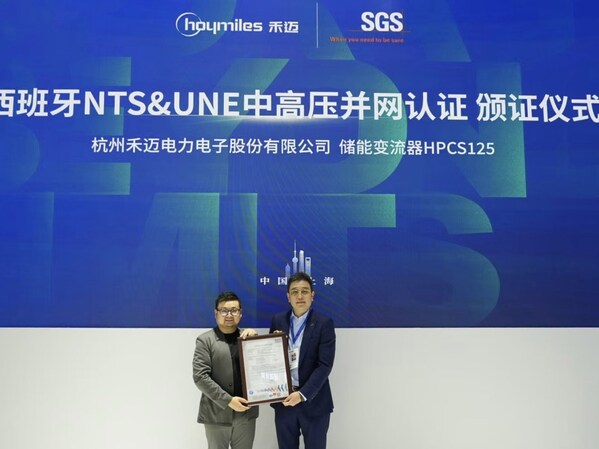 上海 2025年6月16日 /美通社/ — 近日,国际公认的测试、检验和认证机构SGS正式向杭州禾迈电力电子股份有限公司(以下简称:禾迈股份)授予了一系列极具含金量的证书,包括UNE217002、UNE217001、NTs TypeA/B/C/D、RD647/2020以及NTs SENP等。颁证仪式由禾迈股份中国区大区经理石毅与SGS电子电气部可再生与先进能源副总监周全共同参与,双方的携手合作为行业树立了典范。