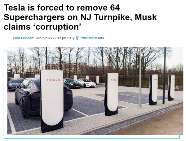 快科技6月4日消息,据海外车媒最新报道,近日,特斯拉因新泽西收费高速公路管理局(NJTA)的决定,被迫拆除其在新泽西收费高速沿线的64个超级充电桩。