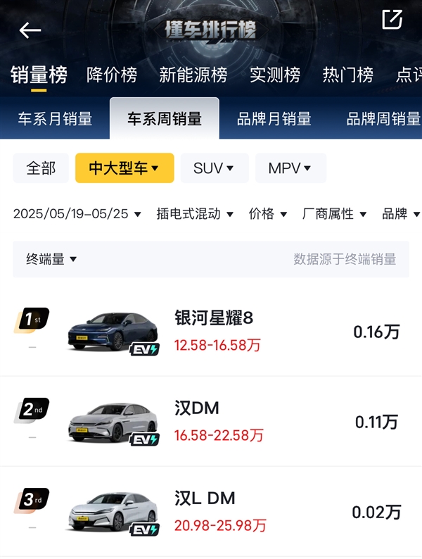 而价格低廉的优势非常明显,数据显示,在上周(5月26日-6月1日)该车上险量达到2330量,几乎是比亚迪汉的两倍,在中大型插电混动轿车领域市占率达到27.75%,排在冠军位置。