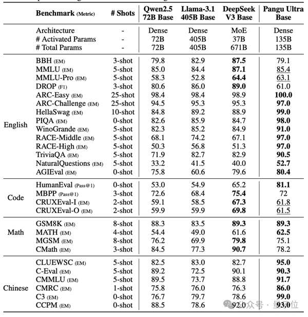 在预训练阶段模型的评测中,盘古Ultra在绝大部分英文基准任务和全部中文任务上取得了最佳性能,优于Llama 405B、DeepSeek-V3等baseline模型。