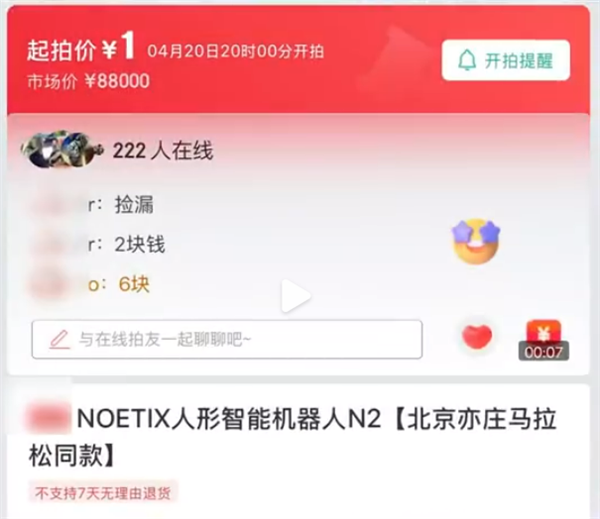 其中,松延动力小顽童队N2获得亚军。比赛结束后,价值8.8万元的N2机器人上线京东拍卖平台,以1元起拍,昨日晚间20:00正式起拍,保证金为2000元。