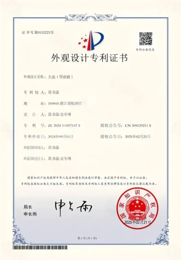 杭州高级中学钱塘学校的一名高二女生葛书菡,却从这一日常困扰中汲取灵感,巧妙地将头盔与雨披融为一体,为妈妈打造出了一款“遮雨神器”,并成功获得了国家专利认证。