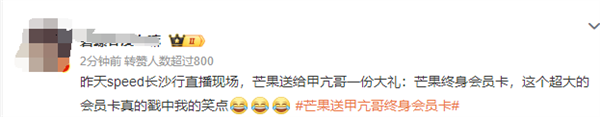 值得一提的是,在直播现场,芒果TV直接给甲亢哥颁发了“门板那么大的终身会员卡”,甲亢哥那个懵圈的表情,配上金光闪闪的”芒果TV VIP”几个大字,综艺效果直接拉满!