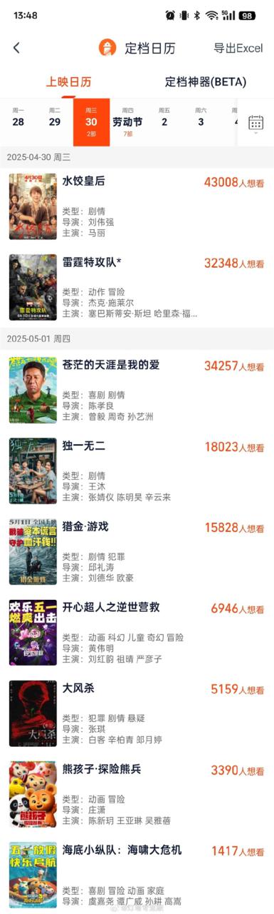 快科技4月8日消息,据灯塔专业版上映日历显示,截至当前,已有9部电影定档2025五一档上映。