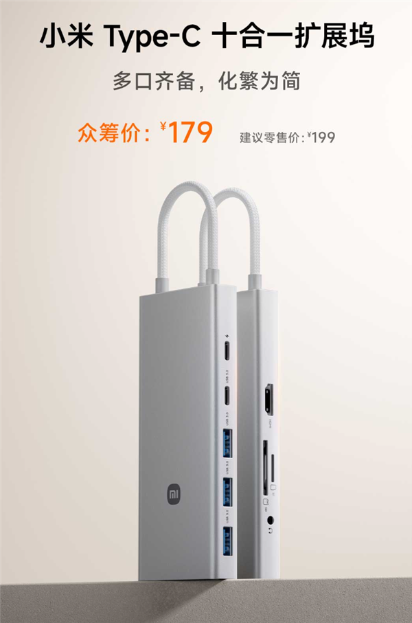 快科技4月10日消息,日前,小米Type-C十合一扩展坞发布,目前已在小米商城、小米有品上架,将于4月16日10:00众筹开售,建议零售价199元,众筹价179元。