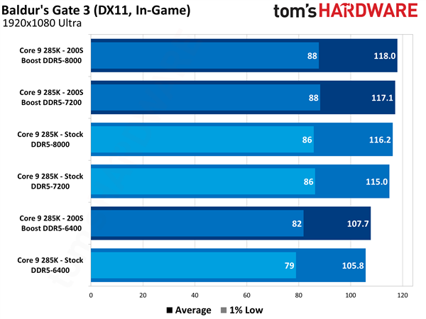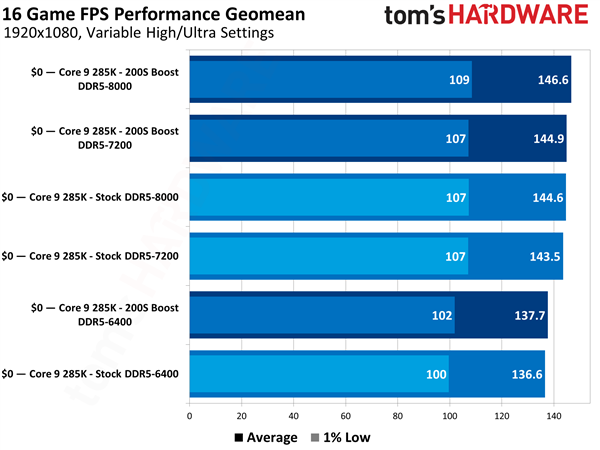 至于实际效果如何,Tom’s Hardware做了详细的测试,1080p分辨率下,使用酷睿Ultra 9 285K、RTX 5090,16款游戏平均提升7.5%。