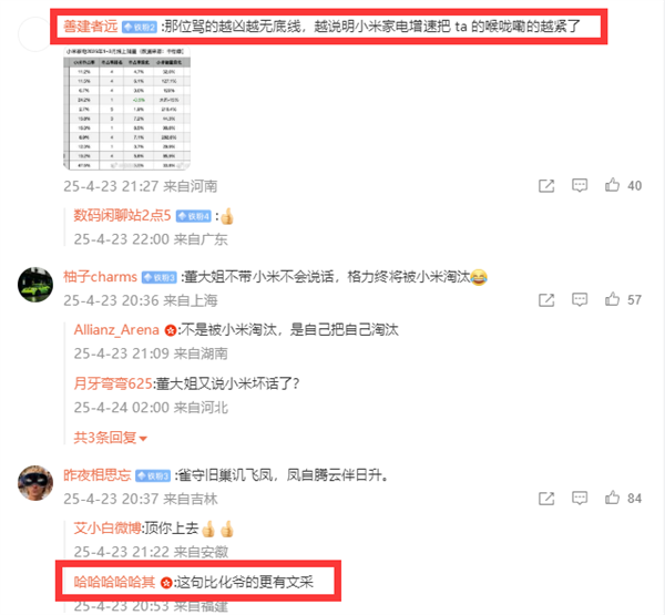 还有一条评论也获得了高点赞:董大姐不带小米不会说话,格力终将被小米淘汰。