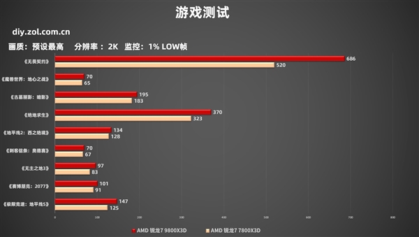1% LOW帧方面,AMD 锐龙7 9800X3D的提升与常规帧数的提升差不多,还是在网游方面提升的更大,整体对比锐龙7 7800X3D提升还是很明显的。
