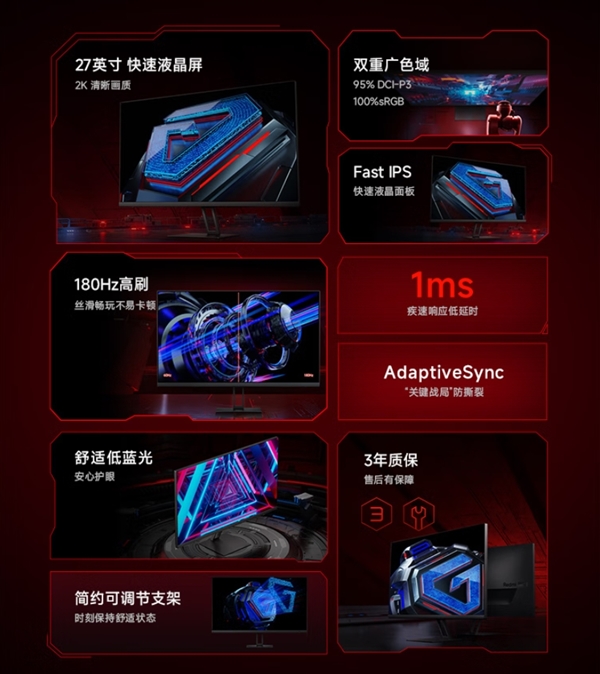 配备一块27英寸IPS屏,分辨率为2560*1440,支持180Hz高刷新率,1ms响应时间,支持100% SRGB、95%DCI-P3广色域,对比度1000:1 (TYP)。