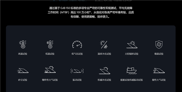 通过基于GJB 150标准的多项专业严苛的可靠性军规测试,平均无故障工作时间(MTBF)高达100万小时。