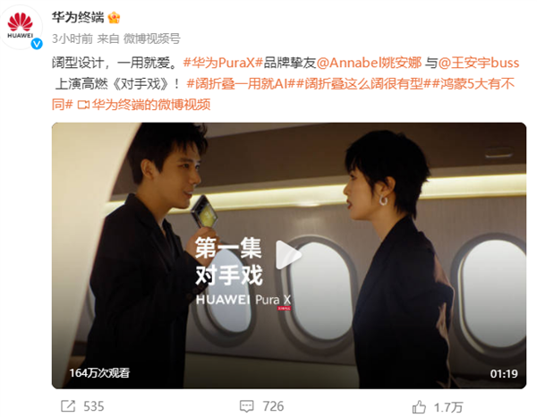 快科技3月27日消息,今日上午,华为官方微博重磅发布由品牌挚友姚安娜、王安宇联袂出演的创意短片《对手戏》与《狭路相逢》,以极具戏剧张力的剧情设计展现华为PuraX新品的独特魅力。
