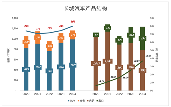 2024年, 出口销量占比提高到36.8%,但毛利润率回升至18.8%,对长城汽车业务贡献率降至39%;