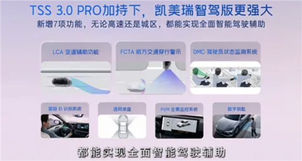 与在售车型相比,智驾版标配TSS 3.0 PRO智能驾驶辅助系统,新增LCA变道辅助、FCTA前方交通穿行警示、DMC驾驶员状态监测等功能。