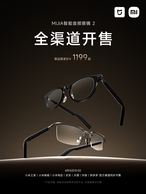 今天,小米MIJIA智能音频眼镜2终于正式上市,相比众筹价稍贵,定价1199元,国补到手价1019.15元。