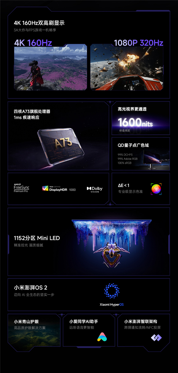 屏幕拥有1600nits峰值亮度,通过DisplayHDR 1000认证,动态对比度1000000:1,支持99% DCI-P3、99% Adobe RGB、100% sRGB广色域覆盖、10bit色深、10.7亿专业色数、色准ΔE<1,支持小米青山护眼。