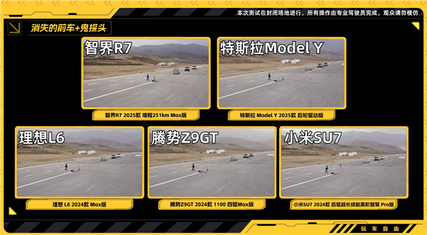 这一场景中模拟的是日常生活中经常出现的鬼探头情况,但组合难度升级,其中智界R7表现优异,不仅有预警还能及时制动,一路通过了80km/h、90km/h和100km/h的测试速度,全场最佳。