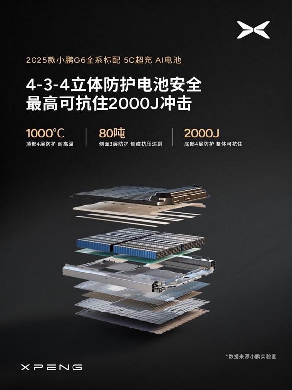 支持4-3-4立体防护电池安全,可耐1000度高温、抗80吨侧压、抵2000J冲击。