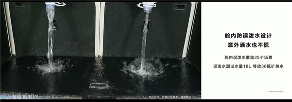 更为重磅的是,M8拥有舱内防误泼水设计,覆盖31个场景,误泼水测试水量18L,等效36瓶矿泉水,足以应对日常生活中不慎洒水的意外。